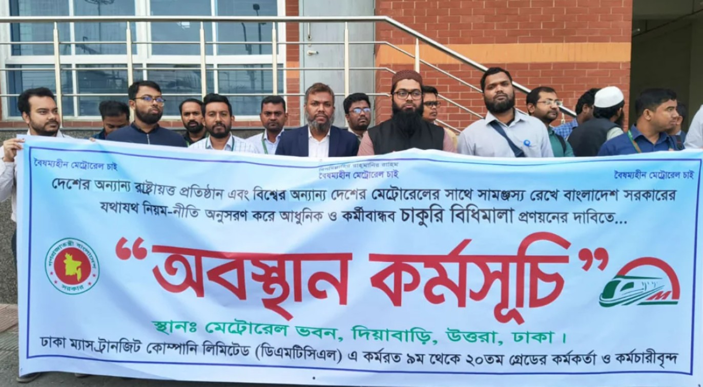 স্বতন্ত্র চাকরি-বিধিমালা প্রণয়নে প্রতিশ্রুতি ভঙ্গের প্রতিবাদে সর্বাত্মক কর্মবিরতিতে গিয়ে রাজধানীর মেট্রোরেল সেবা পুরোপুরি বন্ধ করে দেন ঢাকা ম্যাস ট্রানজিট কোম্পানি লিমিটেডের (ডিএমটিসিএল) নিয়মিত কর্মকর্তা-কর্মচারীরা। শুক্রবার বিকাল ৩টায় উত্তরার দিয়াবাড়িতে অবস্থান কর্মসূচির মধ্য দিয়ে কর্মবিরতি শুরু হয়। এর ফলে নির্ধারিত সময়ে কোনো ট্রেন স্টেশন ছাড়েনি, ভোগান্তিতে পড়েন যাত্রীরা।