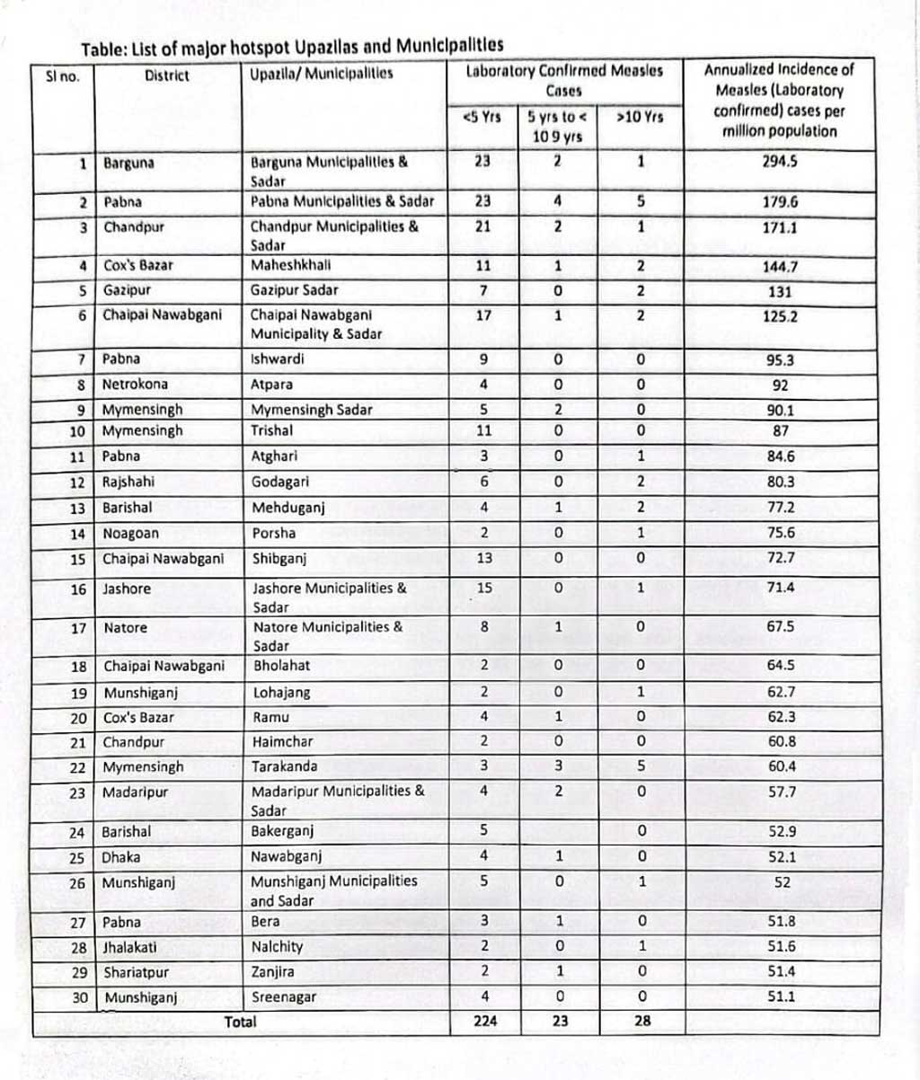 স্বাস্থ্য অধিদপ্তরের তথ্য অনুযায়ী, হামের উপসর্গ নিয়ে গত ২৪ ঘণ্টায় চট্টগ্রাম ও কক্সবাজারে চার শিশুর মৃত্যু হয়েছে। একই সময়ে দেশের আট বিভাগে ৯৪৭ জন শিশু হাসপাতালে ভর্তি হয়েছে, যাদের মধ্যে পরীক্ষায় ৪২ জনের হাম শনাক্ত হয়েছে।
