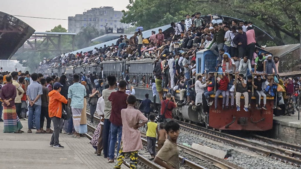 রেলপথেও চাপ ছিল তীব্র। রাজধানী থেকে ছাদে যাত্রী বোঝাই করে ট্রেন ছেড়ে গেছে। তবে দুপুরে বগুড়ার আদমদীঘিতে নীলসাগর এক্সপ্রেস লাইনচ্যুত হওয়ায় উত্তরবঙ্গগামী ট্রেন চলাচল ব্যাহত হয়। এতে যাত্রীদের মধ্যে বিভ্রান্তি দেখা দেয়। রেলওয়ে মন্ত্রণালয় জানিয়েছে, বিকল্প পথে ট্রেন চালানোর ব্যবস্থা করা হচ্ছে, যাতে ঈদযাত্রা ব্যাহত না হয়। তবে কিছু ট্রেনের সময়সূচি বিলম্বিত হতে পারে।