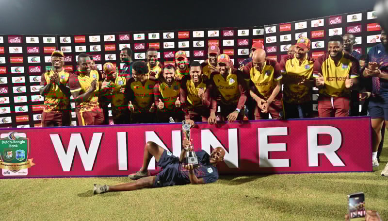 ম্যাচের মাঝপথে আরেক ধাক্কা—গোড়ালির চোটে স্ট্রেচারে করে মাঠ ছাড়েন উইকেটরক্ষক নুরুল হাসান সোহান। এরপর ২৭ রানে থাকা আকিম অগাস্টের ক্যাচও ফেলে দেন বদলি ফিল্ডার তানজিম হাসান সাকিব। জীবন পেয়ে অগাস্ট ব্যাটিংয়ে আগ্রাসী হয়ে উঠেন এবং মাত্র ২৪ বলে তুলে নেন ফিফটি। সঙ্গ পান রোস্টন চেজের, তিনিও ২৯ বলে ফিফটি করে ম্যাচ পুরোপুরি ক্যারিবীয় নিয়ন্ত্রণে নিয়ে নেন। রিশাদ এক ওভারেই চেজ ও অগাস্টকে ফিরিয়ে দিলেও ততক্ষণে অনেক দেরি। শেষ পর্যন্ত ১৯ বল হাতে রেখে ১৬.৫ ওভারে ৫ উইকেট হারিয়ে জয় তুলে নেয় ওয়েস্ট ইন্ডিজ। বাংলাদেশের হয়ে রিশাদ ৩টি এবং নাসুম ও মেহেদী ১টি করে উইকেট নেন।