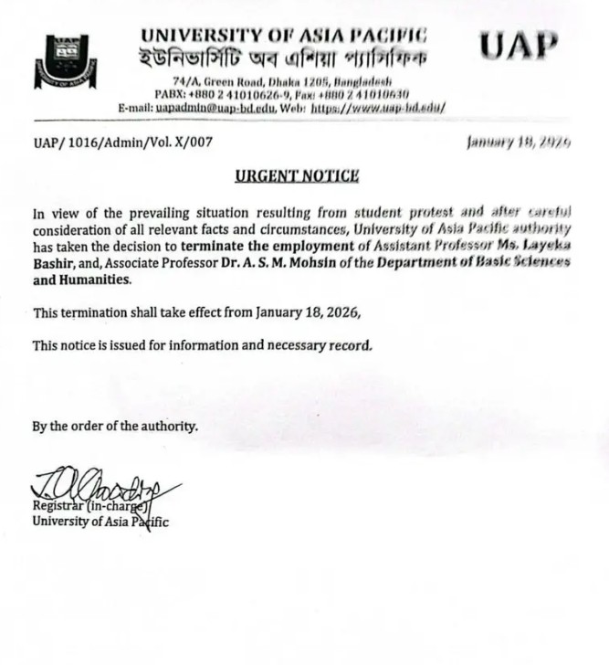 ঢাকার বেসরকারি বিশ্ববিদ্যালয় ইউনিভার্সিটি অব এশিয়া প্যাসিফিকে (ইউএপি) উদ্ভূত পরিস্থিতির জেরে দুই শিক্ষককে চাকরিচ্যুত করার পর এবার অনির্দিষ্টকালের জন্য সব ক্লাস স্থগিত করেছে কর্তৃপক্ষ। হিজাব ও নিকাব বিষয়ে সামাজিক যোগাযোগমাধ্যমে দেওয়া মন্তব্য এবং রাজনৈতিক পক্ষপাতের অভিযোগ ঘিরে এই সিদ্ধান্ত দেশজুড়ে বিতর্ক সৃষ্টি করেছে। শিক্ষার্থীদের আন্দোলন, প্রশাসনিক সিদ্ধান্ত, অভিযুক্ত শিক্ষকদের বক্তব্য এবং শিক্ষক সংগঠনগুলোর প্রতিক্রিয়া মিলিয়ে ঘটনাটি একাধিক মাত্রায় আলোচিত হচ্ছে।