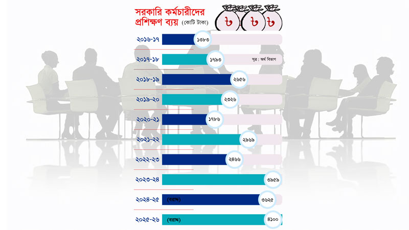 গত এক দশকে সরকারি কর্মচারীদের প্রশিক্ষণে ব্যয় হয়েছে অন্তত ২২ হাজার কোটি টাকা। অর্থ বিভাগের তথ্য অনুযায়ী, ২০১৬-১৭ থেকে ২০২৩-২৪ অর্থবছর পর্যন্ত প্রশিক্ষণ খাতে ব্যয় হয়েছে ১৯ হাজার ৩৩৮ কোটি টাকা। ২০২৪-২৫ অর্থবছরে সংশোধিত বাজেটে বরাদ্দ ছিল ৩ হাজার ৬২৫ কোটি টাকা এবং চলতি ২০২৫-২৬ অর্থবছরের বাজেটে রাখা হয়েছে ৪ হাজার ১০০ কোটি টাকা। তবে এত বিপুল ব্যয়ের পরও প্রশিক্ষণের বাস্তব সুফল দৃশ্যমান নয় বলে মনে করছেন বিশ্লেষকরা।