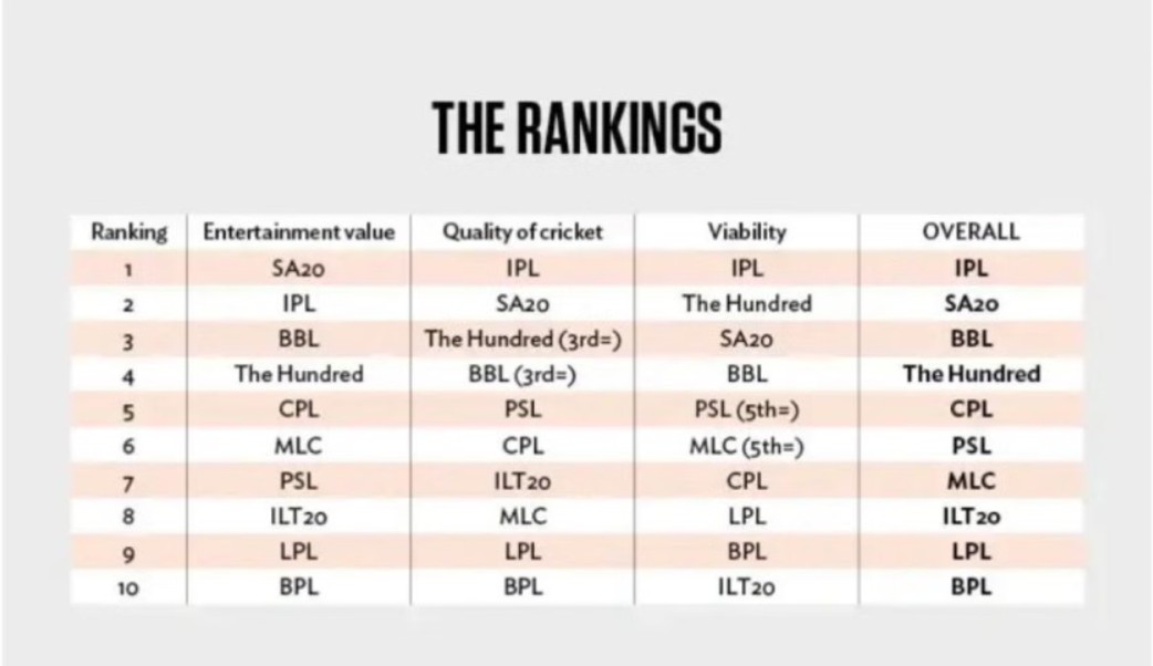 র্যাঙ্কিংয়ে ভারতের ইন্ডিয়ান প্রিমিয়ার লিগ (আইপিএল) রয়েছে শীর্ষে। ক্রিকেটের মান ও গ্রহণযোগ্যতার বিচারে আইপিএল প্রথম হলেও বিনোদনের দিক থেকে শীর্ষে রাখা হয়েছে দক্ষিণ আফ্রিকার এসএ টি-টোয়েন্টি লিগকে। আইপিএলের পরেই রয়েছে বিগ ব্যাশ লিগ, দ্য হানড্রেড ও এসএ টি-টোয়েন্টি। বিপিএলের চেয়ে এগিয়ে আছে শ্রীলঙ্কার লঙ্কান প্রিমিয়ার লিগ (এলপিএল) এবং যুক্তরাষ্ট্রের মেজর লিগ ক্রিকেটও।