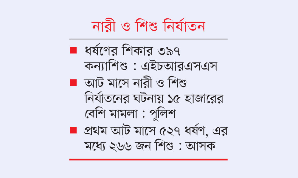 পুলিশ সদর দপ্তরের তথ্যমতে, গত আট মাসে নারী ও শিশু নির্যাতনের ঘটনায় সারা দেশে ১৫ হাজার ৩৪টি মামলা হয়েছে। অর্থাৎ প্রতিদিন গড়ে ৬০টির বেশি মামলা।