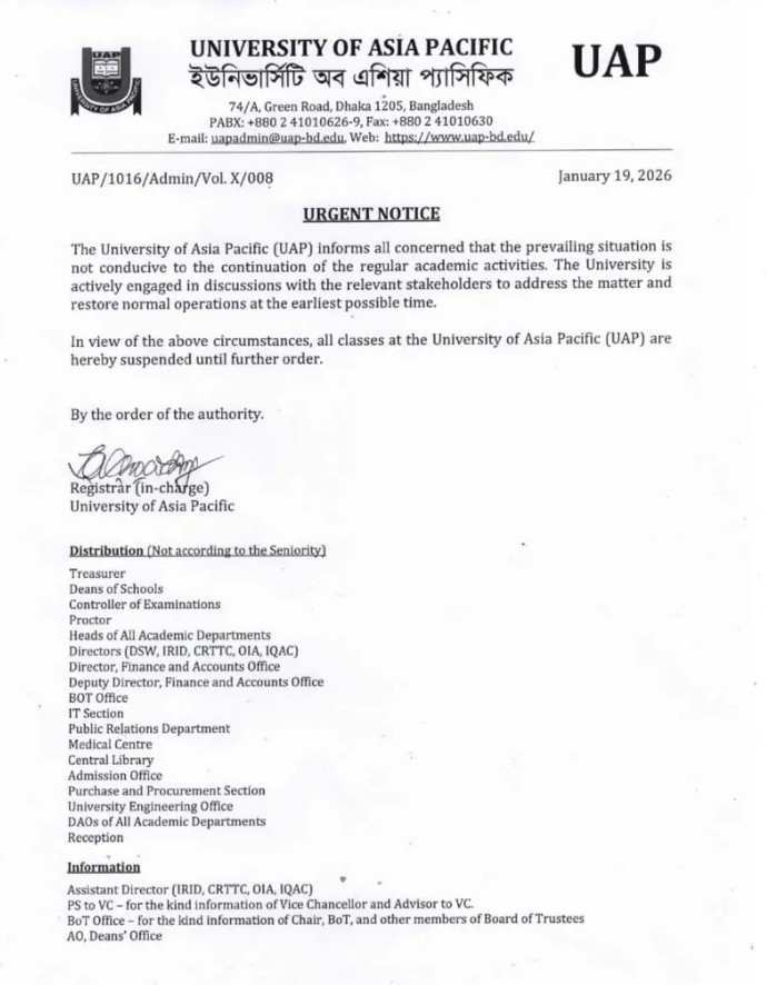 ঢাকার বেসরকারি বিশ্ববিদ্যালয় ইউনিভার্সিটি অব এশিয়া প্যাসিফিকে (ইউএপি) উদ্ভূত পরিস্থিতির জেরে দুই শিক্ষককে চাকরিচ্যুত করার পর এবার অনির্দিষ্টকালের জন্য সব ক্লাস স্থগিত করেছে কর্তৃপক্ষ। হিজাব ও নিকাব বিষয়ে সামাজিক যোগাযোগমাধ্যমে দেওয়া মন্তব্য এবং রাজনৈতিক পক্ষপাতের অভিযোগ ঘিরে এই সিদ্ধান্ত দেশজুড়ে বিতর্ক সৃষ্টি করেছে। শিক্ষার্থীদের আন্দোলন, প্রশাসনিক সিদ্ধান্ত, অভিযুক্ত শিক্ষকদের বক্তব্য এবং শিক্ষক সংগঠনগুলোর প্রতিক্রিয়া মিলিয়ে ঘটনাটি একাধিক মাত্রায় আলোচিত হচ্ছে।
