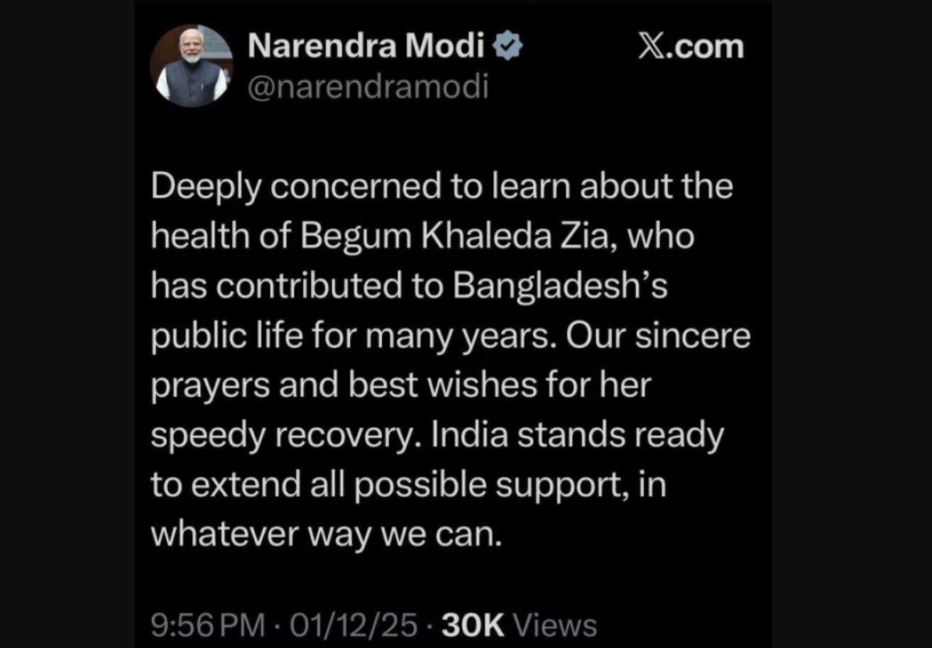 ভারতের প্রধানমন্ত্রী নরেন্দ্র মোদী বিএনপি চেয়ারপারসন ও সাবেক প্রধানমন্ত্রী বেগম খালেদা জিয়ার দ্রুত আরোগ্য কামনা করেছেন। সোমবার সন্ধ্যায় সামাজিক যোগাযোগমাধ্যম এক্সে দেওয়া এক পোস্টে তিনি লেখেন, “বেগম খালেদা জিয়ার শারীরিক অবস্থার কথা জেনে আমি গভীরভাবে উদ্বিগ্ন, যিনি দীর্ঘদিন বাংলাদেশের জনজীবনে অবদান রেখেছেন। তার দ্রুত আরোগ্য লাভের জন্য আমাদের প্রার্থনা ও শুভকামনা। যেকোনোভাবে পারি, সম্ভাব্য সব ধরনের সহযোগিতা দিতে ভারত প্রস্তুত।”